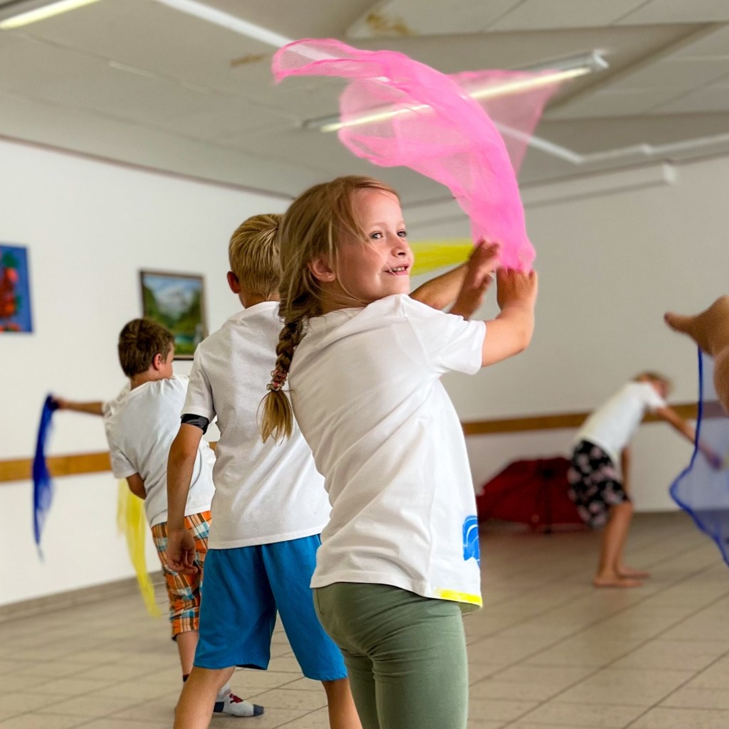 Im Kindertanz arbeite ich nach der Methode von Rudolf von Laban. Der Tanz entsteht aus dem Inneren. Mit kindgerechten Aufgaben und Impulsen erweitern die Kinder Schritt für Schritt ihr Bewegungsrepertoire. Sie lernen unterschiedliche Bewegungsqualitäten und Parameter wie Körper, Raum, Antrieb und Beziehung kennen (und lernen somit für ihr Leben). Es geht vor allem darum, Bewegungen zu entdecken, zu erforschen und diese in tänzerische Bewegungen umzuwandeln. So kann ich z.B. mit der Hand kräftig drücken oder mit dem Finger sanft tupfen. Materialien unterstützen die Kinder beim Erforschen, Entdecken und Experimentieren mit unterschiedlichen Bewegungsqualitäten.